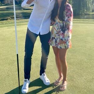 Vibrant multicolor dress with ruffled details. Features long sleeves and a flowing silhouette. Perfect for a bold statement.