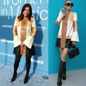Condition: I’m selling this dress as is. It is NEW with imperfections. There is discoloration throughout as pictured. It looks like color transfer from the black faux leather to the other lighter areas. Please review pics.