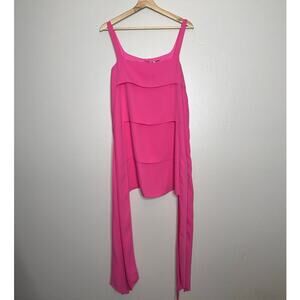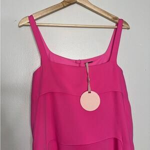 keywords: draped, tiered, bright pink, Barbie pink, magenta, square neck, sash, wedding guest, event, formal, designer, feminine, femme, girly, effortless, chic, statement, baby shower, gender reveal