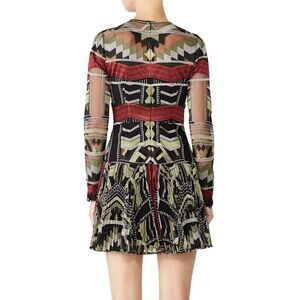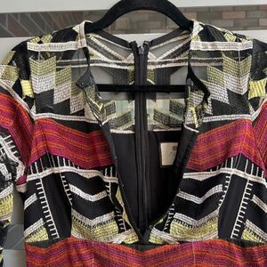 ALEXIS 'Nalory' pleated geometric embroidered mini dress. Deep v-neckline with optional snap closure, long sheer sleeves, and a ruffled skirt for a standout twirl-worthy silhouette. Multi embroidered organza. Hidden back zipper closure. Fully lined. In excellent condition - note that due to the delicate embroidery of the dress, minor snags may occur easily. Size small - 16.5" pit to pit; 14" waist; 24" sleeve length; 24" length from pit, 33.5" total length.