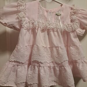 vintage Charming pink dress with lace detailing. Features tiered ruffles and short sleeves. Perfect for formal occasions.