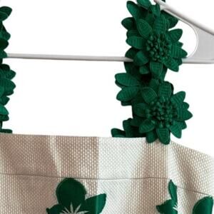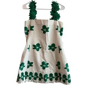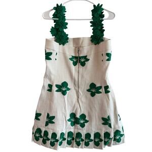Alexis Pixy Floral Mini Dress in White Green. Size M / Medium. Features square neckline, sleeveless, A-line silhouette, pleated hem, 3D floral appliques on straps, floral appliques throughout, honeycomb fabrication, exposed back zipper closure, mini length. 56% polyester, 22% cotton, 16% viscose, 4% linen, 2% elastane. Excellent condition, no flaws.