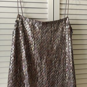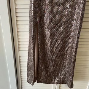Alexis' slinky midi-dress shimmers in the light, finished with snakeskin-inspired metallics. Cut with a side slit, this fluid style features a clean straight neck with thin shoulder straps. Designed to beautifully catch the light, this pailette-embellished dress is suspended from slim, barely-there shoulder straps and falls to a split midi hem. Add metallic sandals and a clutch to complete your look.Straight neck. Slim Fit. Lavender sequin.