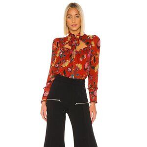 Vibrant red blouse with floral print. Features a tie-neck design. Long sleeves with ruffle details.