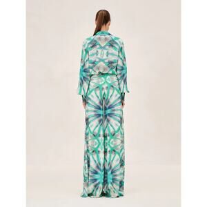 This Alexis set includes the Eres button-up top and Andy wide-leg pants in a green kaleidoscope tie-dye print. This coordinated ensemble combines relaxed tailoring with bold patterning for a striking statement look.