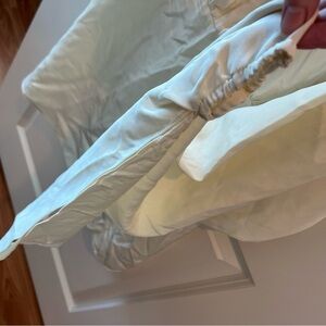 Adjustable spaghetti strap with one loose fit shoulder sleeve. Three-quarter length sleeve with elastic band. Zippered side and built-in inner