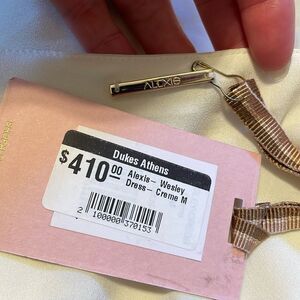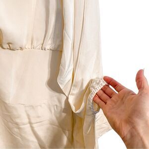 Features: asymmetric design, tie shoulder detail, one long sleeve with draped overlay and elastic cuff, hidden side zipper, fully lined, satin finish, 100% silk, in crème