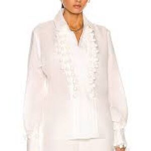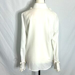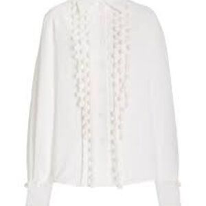 Elegant white blouse. Features pom pom details. Long sleeves. Perfect for chic occasions.