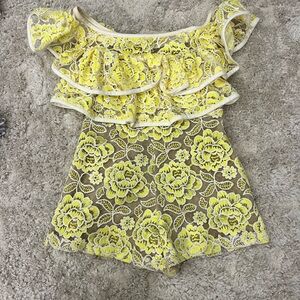 DETAIL: beautiful lemonade yellow crochet lace ruffle off shoulder jumpsuit. High waisted shorts, white trim, zipper on the side. Great for a wedding!