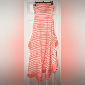 • Hemline: Dramatic high-low hem with a wide coral border — shorter in the front, flowing longer in the back for a show-stopping effect. Its lightweight fabric ensures comfort and elegance, making it an ideal choice for warm weather occasions.