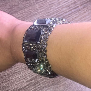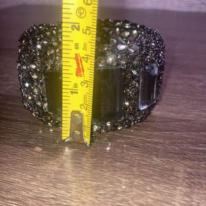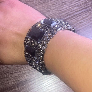 Pre owned Womens Alexis Bittar Bangle Cuff Bracelet with High Quality Crystals Gun Metal Shade in great shape original dust bag not included sorry my wrist is a 6” so fits big inside is 8” outside is 9”