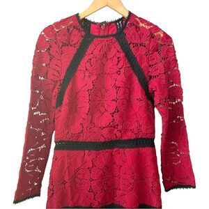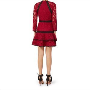 Long sleeve elegant tiered and ruffled red and black lace embroidered flower short dress.