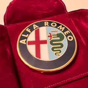For the car aficionado and Alfa Romeo lover! This is a great collectors piece. An Alfa Romeo brass paperweight, with an enamel crest and felt bottom. This paperweight comes with a custom burgundy pocket /pouch with snap enclosure. Both are in excellent condition but the pouch shows light wear. Please see pictures for condition and measurements.