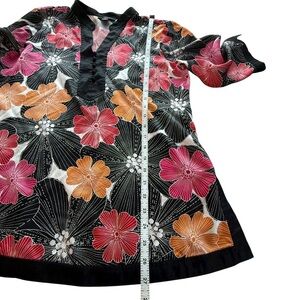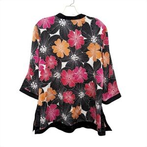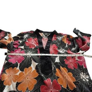 alfani silk blouse, floral tunic top, v-neck 3/4 sleeve, black pink orange, lightweight silk shirt, boho chic blouse, designer workwear, spring summer top