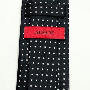 Vintage Alfani 100% silk tie in black with white dots. Add this sophisticated neckpiece to your wardrobe for a classic, throwback look. Beautifully crafted and maintained in a smoke free environment. No stains, blemishes or fraying. Like New and rarely worn. Couple this piece with a white shirt and black sportcoat for a stylish look!