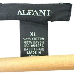 Stylish black cardigan by Alfani. Features gold buttons and ribbed collar. Perfect for layering. Thui sweater has buttons and zippered pocket. This sweater is in excellent condition. It is a cotton blend with 3% Angora.