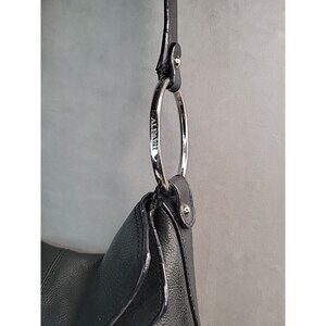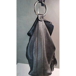 Alfani Black Pebbled Leather Hobo Shoulder Bag Fold Over Tassel Silver Rings EC