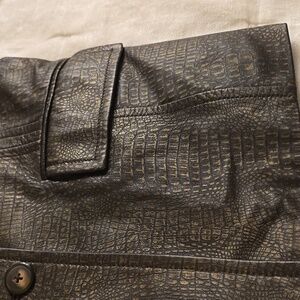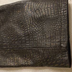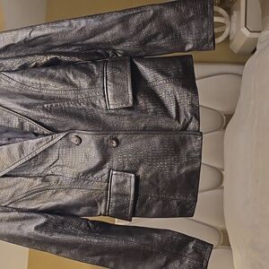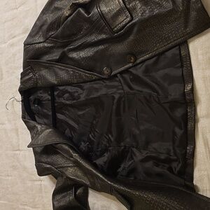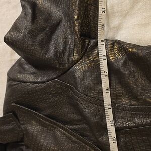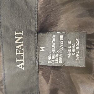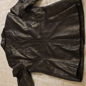 Elegant Alfani leather jacket with a sleek texture. Ideal for chic styling. Beautiful gold accents. Very good quality and condition. Looks like new and still has de silica bags on the 2 pockets. Soft leather. Beautiful flattering silhouette on the back and front.