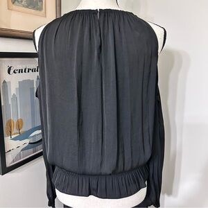 Black top and bottom set. Top is blouson style with cutout shoulders with peplum elastic waist. Pants are palazzo style with pockets and wrap belt. Soft flowy lightweight fabric.