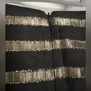 Alfani Black and Gold Metallic Striped Long Sleeve Blouse. Black blouse with textured gold metallic stripes. Round neckline, long sleeves. Lined. Hidden zipper up the back. Size Large.