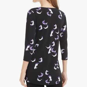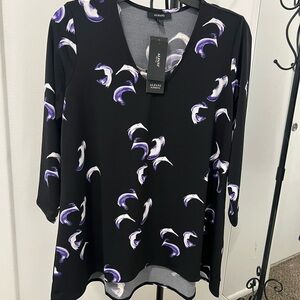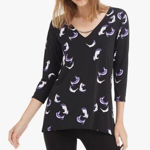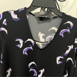 Stylish Alfani blouse with a V-neckline. Features a unique purple pattern on a black background. Perfect for any occasion.