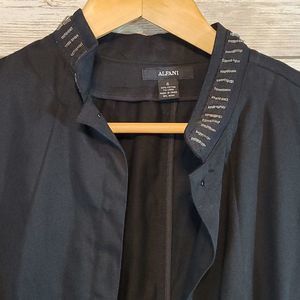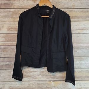 NWT black jacket, two functional pockets, beading at wrists and neck, hook and eye closure all the way down front. cotton/linen blend.
