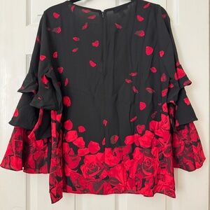 Alfani Blouse - Black with Red roses Size L Long sleeves ruffled. 100% polyester. Makes for a perfect Valentine's Day blouse.