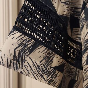 Sophisticated in a contemporary print, A-line dress features elegant crochet trim at the sleeves and hem.