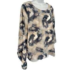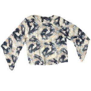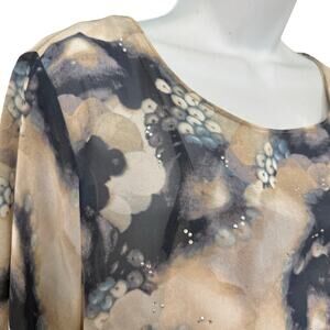 Alfani Cream Tan Blue Swirl Bell Sleeve Chiffon Sheer Attached Tank Blouse sz L
