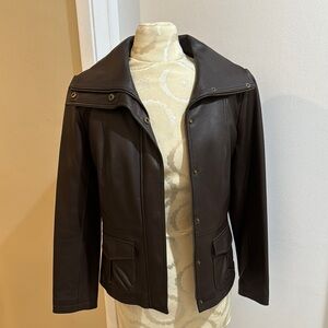 Alfani Dark Brown Genuine Leather Urban High Collar Pockets Snap Zip Up Jacket P