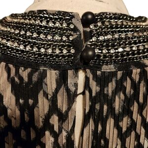 Sleeveless blouse embellished with a waterfall neckline of black chains and rhinestones. Creates a necklace type collar.