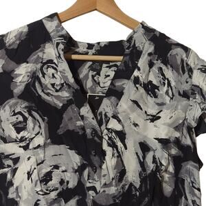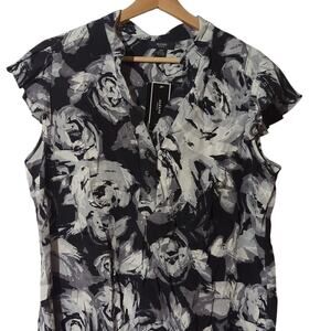 Floral, Silk, Blouse, Button Front, Ruffle Sleeve, Black, Gray, White, Abstract, Light Weight, Dressy, Workwear, Office, Summer, Spring, Capsule Wardrobe, Elegant, Modern, Classic, Soft, Comfortable, Feminine, Chic, Versatile, Stylish, Minimalist, Ann Taylor, Banana Republic, Loft, Express, Zara, H&M, Anthropologie, Special Occasion, Date Night, Cocktail, Travel, Breathable, Boutique, Wardrobe Staple, Must Have, Gift, Statement