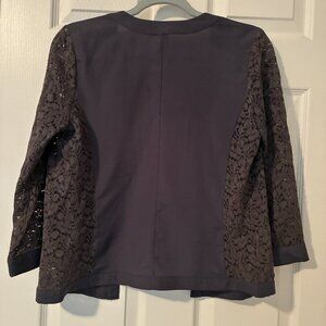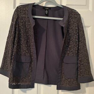 Light gray, lightweight blazer. Very soft and elegant. Materials: Nylon, Spandex, Polyester. In great condition - only work once!