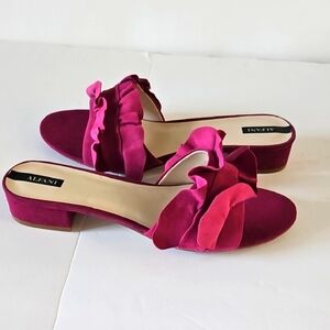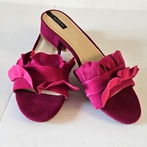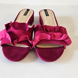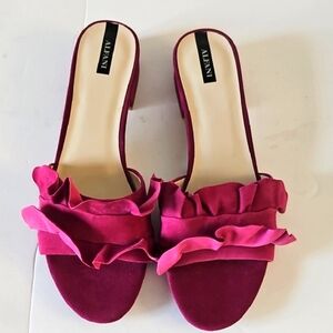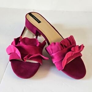 Elegant magenta mules with ruffle detail. Ideal for a chic ensemble. Never Worn.