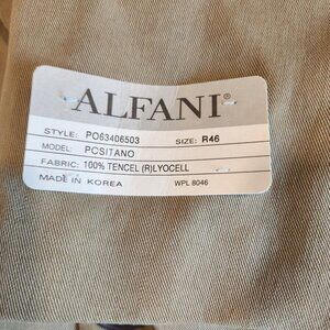 This Alfani Men's Blazer is a size 46R jacket in a stylish beige color, made from high-performance Tencel fabric. The blazer features a four-button sleeve design, notch lapel style, and a ventless jacket vent style. It is a single-breasted blazer with a three-button front closure and a regular jacket/coat length. The inner pockets and stretch material add practicality and comfort to this classic designer piece, suitable for various occasions such as travel, weddings, parties, formal events, or business meetings.