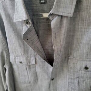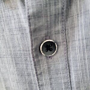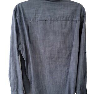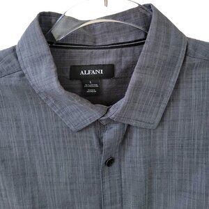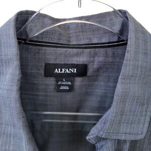 Elevate your wardrobe with this Alfani men's grey button-down shirt, crafted from luxuriously soft, textured fabric for all-day comfort and versatile style. Featuring a unique button adorned with a decorative emblem, this shirt effortlessly blends sophistication and individuality—ideal for both casual gatherings and semi-formal events.