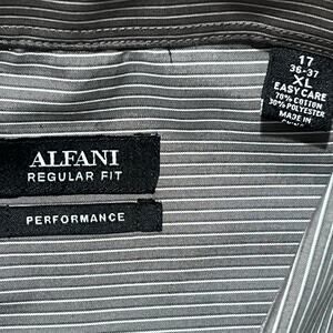 This Alfani men's dress shirt is new with tags and in excellent condition. It features a stylish gray stripe pattern, a regular fit, and performance stretch fabric for ultimate comfort. Perfect for the office or a night out!