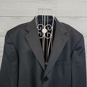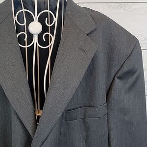 Clean lines and polished grey tone 100% wool single breasted suit jacket by Alfani with 3 button closure, notched lapel, and fully satin lined. Great pre-owned condition in a 48R.