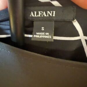 Chic Alfani blouse with geometric black and white design. Versatile and elegant.