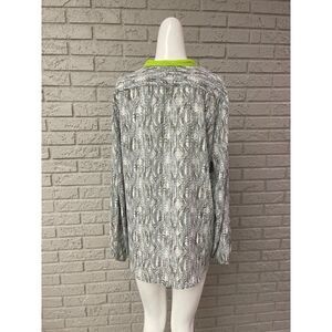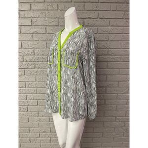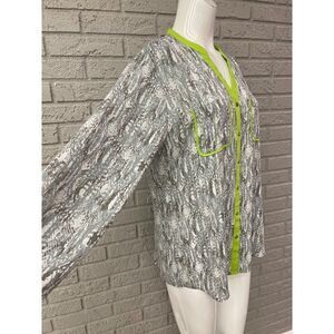 • Gray animal print with lime green trim around neck, on front and on pockets