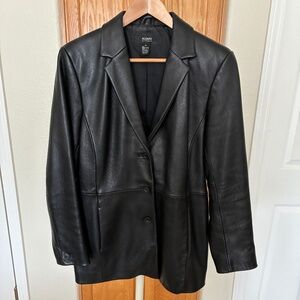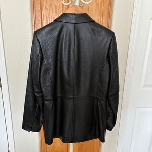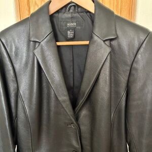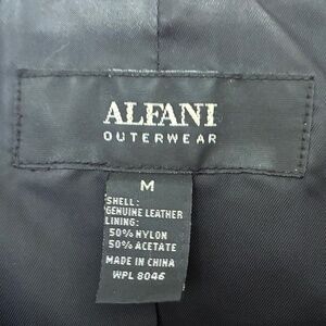 Beautiful black genuine leather jacket from Alfani Outerwear in excellent like new condition. Fitted styling. Size medium, measures 19.5” armpit to armpit, 29” long.