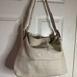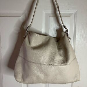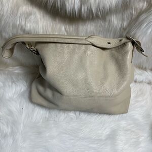 Alfani Pebble Leather Beige Medium shoulder bag with silver tone hardwares top magnetic closure the inside lining has a zipper compartment a side zipper and two side pockets. Pre owned in good used condition small light transfer marks on on the back of the bag see all pictures any questions please message.