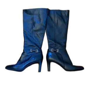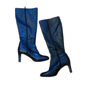 Classic black knee-high leather riding boots with a sleek, timeless look. Features a full-length inner ankle zipper for easy on/off and a comfortable 3” heel.
