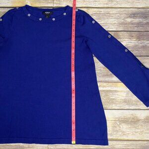 Add some sparkle to your wardrobe with this Alfani Petite Colbalt Blue Studded 3/4 Sleeve Top in size S. The round neckline and pullover design make it a versatile piece for any occasion, whether it's a party, work, or just a casual day out. The knit fabric, made of a blend of nylon and rayon, gives it a comfortable fit and allows for easy machine washing. The top features a solid colbalt blue color with silver studded accents, adding a touch of elegance to the classic fit. Whether you're going for a hipster, designer, or preppy look, this top is perfect for you. It's also a great gift option for any occasion. Don't miss out on this stylish and comfortable piece for your wardrobe.