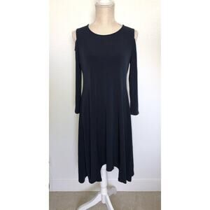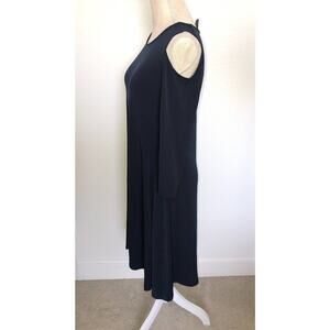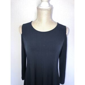 Add this basic to your transitional wardrobe. It is a gorgeous minimalist shift dress in navy. The neckline is a scoop neckline and the shoulders are a cold shoulder or peek-a-boo style. The sleeve are a three-quarters sleeve. It is a great shift dress that can easily be dressed up or down. It is a midi length. There is a little spandex in the material so it makes for a comfortable fit. New with tags