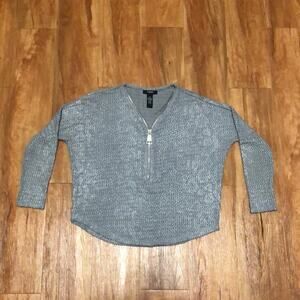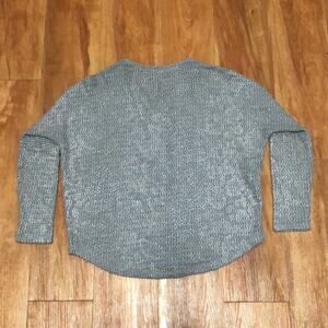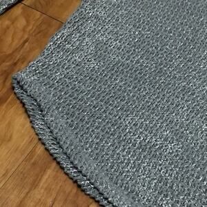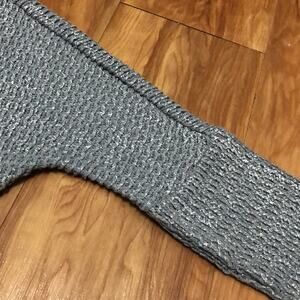 • Other information: Long sleeve. Zippered at the front. Slightly curved hemline. Loose enough knit that a shirt probably should be worn underneath. The color is a light/medium shade of blue/gray with threads that are silver mixed in for some decorative accent. It’s a pretty and eye catching shine/shimmer. See the first and final image for most accurate color.