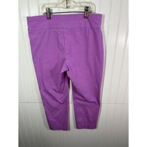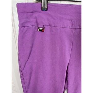 These Alfani skinny pants are designed in a stylish capri length with a slim fit and mid-rise waist of 31 inches. The pull-on design and tummy control feature provide a comfortable and flattering wear. Made from a blend of nylon, spandex, and rayon, these pants offer stretch and flexibility. The purple color and flat front design make them suitable for casual occasions in winter, summer, fall, and spring. Additionally, they have pockets and a 21.5-inch inseam, perfect for everyday wear. Gently cleaned. Comes from smoke free and cat free.