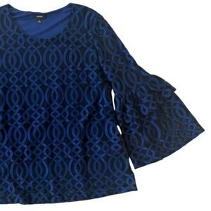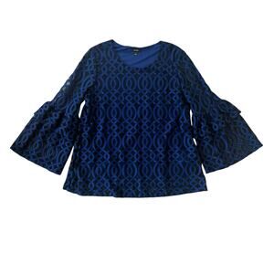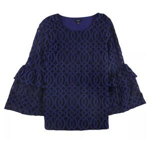 Alfani Pullover Round Neck Blouse Tiered Bell Sleeves Top Navy Blue Size Large