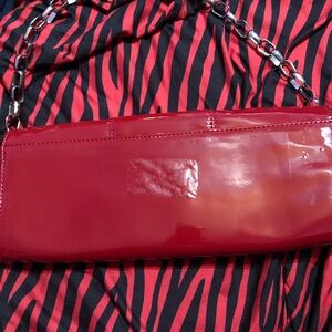 Sleek and stylish red patent leather clutch with a chic silver buckle and attachable chain. Perfect for adding a pop of color to any outfit. Small imperfection of stuck on adhesive from where the price tag was put when it went on sale, I think it probably can be removed, I just don’t know how and have already gotten a replacement, so open to offers below the listing price if interested send an offer ❤️