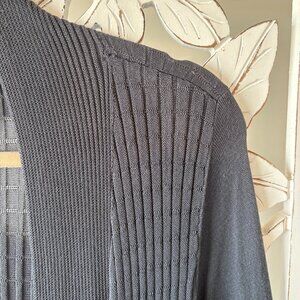 Cardigan has a ribbed neckline and vertical band, rectangular pattern on front and full back with plain sleeves. Cardigan has slight scoop back.